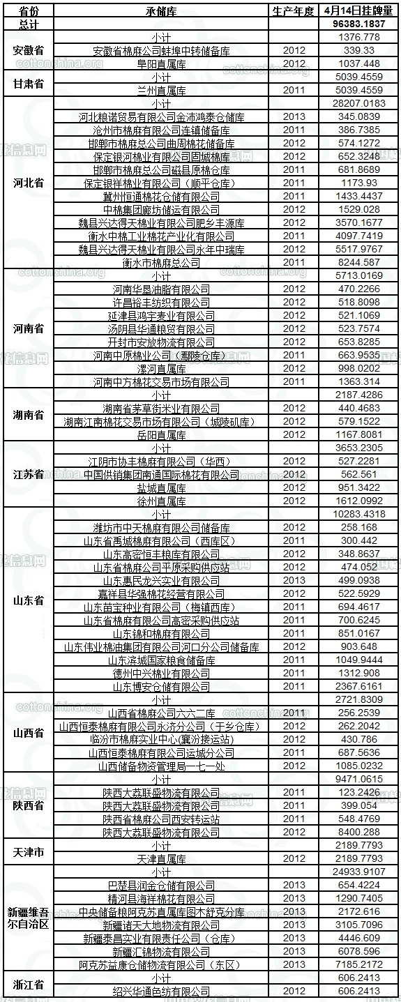 定于4月14日出庫銷售儲備棉96383.1837噸。其中2011年度國產(chǎn)棉29694.0927噸;2011年度國產(chǎn)棉(新標(biāo)準(zhǔn))2682.5451噸,2012年度國產(chǎn)棉(新標(biāo)準(zhǔn))38228.4575噸,2013年度國產(chǎn)棉(新標(biāo)準(zhǔn))25778.0884噸。相關(guān)批次公檢數(shù)據(jù)見附件。具體庫點如下: