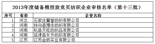 2013年度儲(chǔ)備棉投放競(jìng)買紡織企業(yè)審核名單新(第十三批)