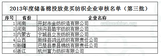 2013年度儲備棉投放競買紡織企業(yè)審核名單新(第三批)