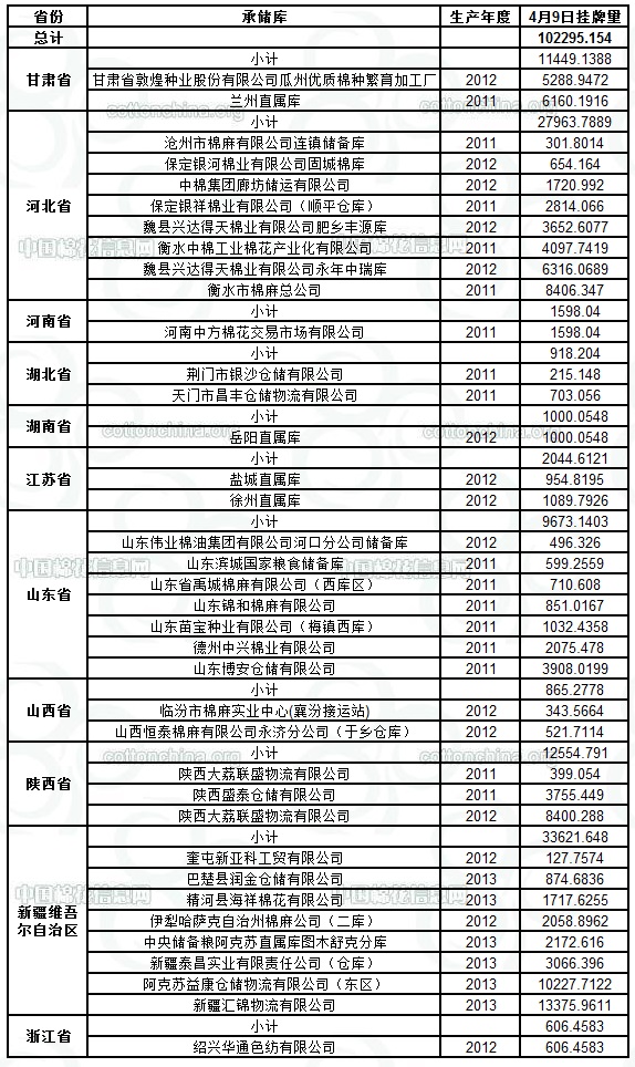 各紡織企業(yè): 定于4月9日出庫銷售儲備棉102295.154噸。其中2011年度國產(chǎn)棉37627.7092噸;2012年度國產(chǎn)棉(新標準)33232.4504噸,2013年度國產(chǎn)棉(新標準)31434.9944噸。相關批次公檢數(shù)據(jù)見附件。具體庫點如下: