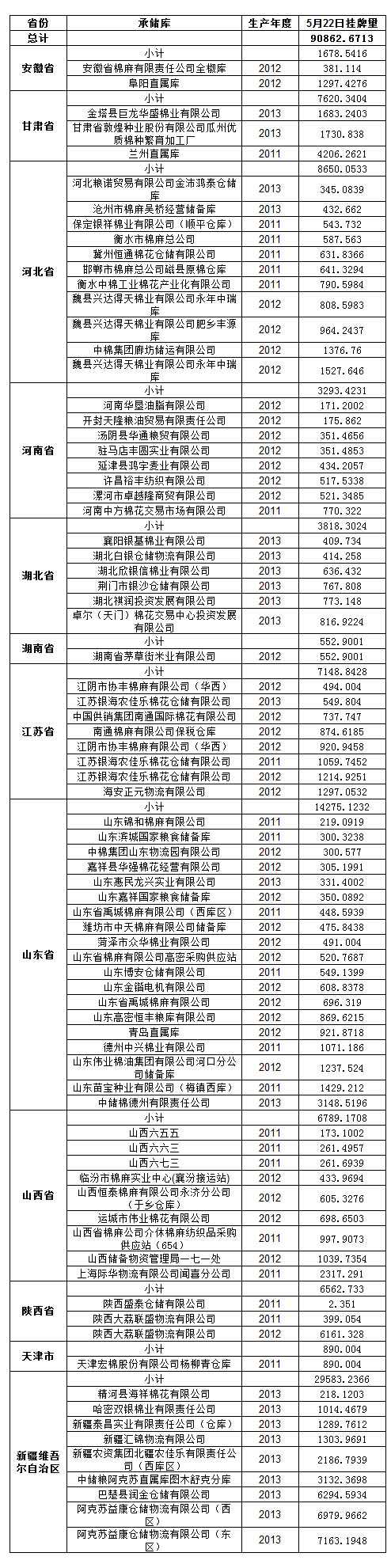 定于5月22日出庫(kù)銷售儲(chǔ)備棉90862.6713噸,其中2011年度國(guó)產(chǎn)棉18551.8333噸,2012年度國(guó)產(chǎn)棉30687.751噸,2013年度國(guó)產(chǎn)棉41623.087噸。今日無(wú)進(jìn)口棉。相關(guān)批次公檢數(shù)據(jù)見附件。具體庫(kù)點(diǎn)如下: