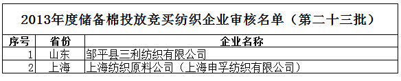 2013年度儲(chǔ)備棉投放競(jìng)買紡織企業(yè)審核名單新(第二十三批)