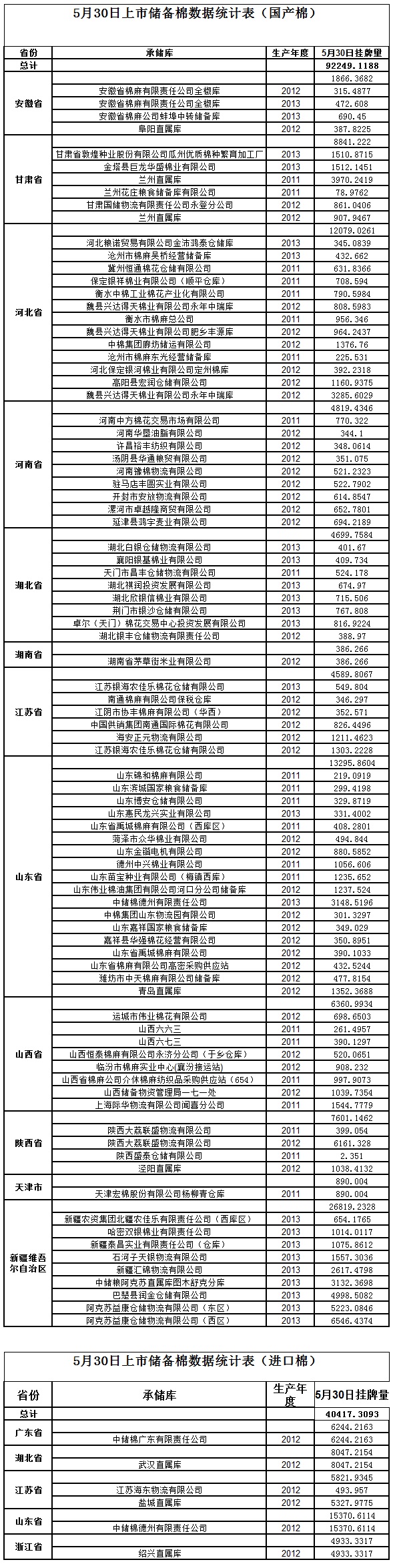 定于5月30日出庫(kù)銷(xiāo)售儲(chǔ)備棉132666.4281噸,其中國(guó)產(chǎn)棉92249.1188噸,進(jìn)口棉40417.3093噸。相關(guān)批次公檢數(shù)據(jù)見(jiàn)附件。具體庫(kù)點(diǎn)如下: