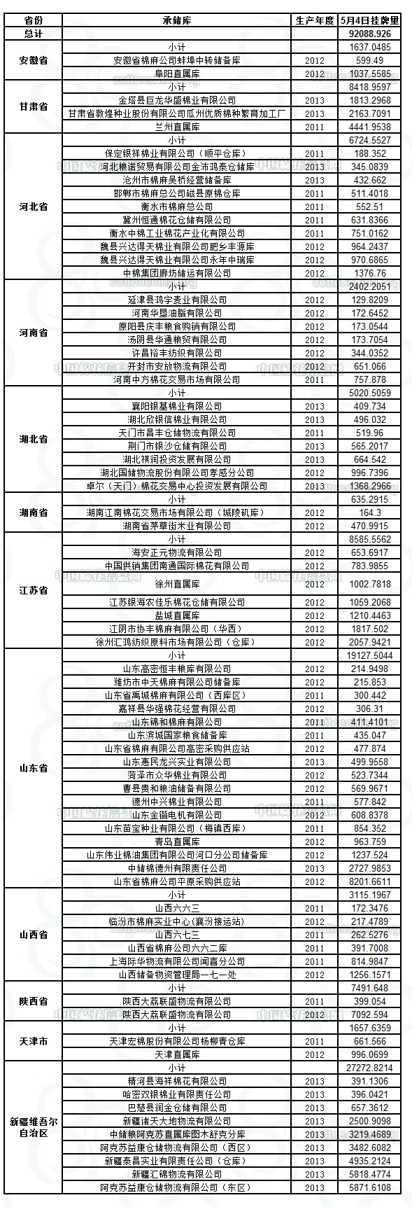 各紡織企業(yè): 定于5月4日出庫銷售儲(chǔ)備棉92088.9260噸。其中2011年度國產(chǎn)棉13636.1822噸,2012年度國產(chǎn)棉39693.4232噸,2013年度國產(chǎn)棉38759.3206噸。今日無進(jìn)口棉。相關(guān)批次公檢數(shù)據(jù)見附件。具體庫點(diǎn)如下: