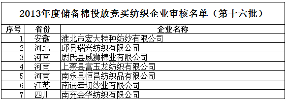 2013年度儲(chǔ)備棉投放競(jìng)買(mǎi)紡織企業(yè)審核名單新(第十六批)