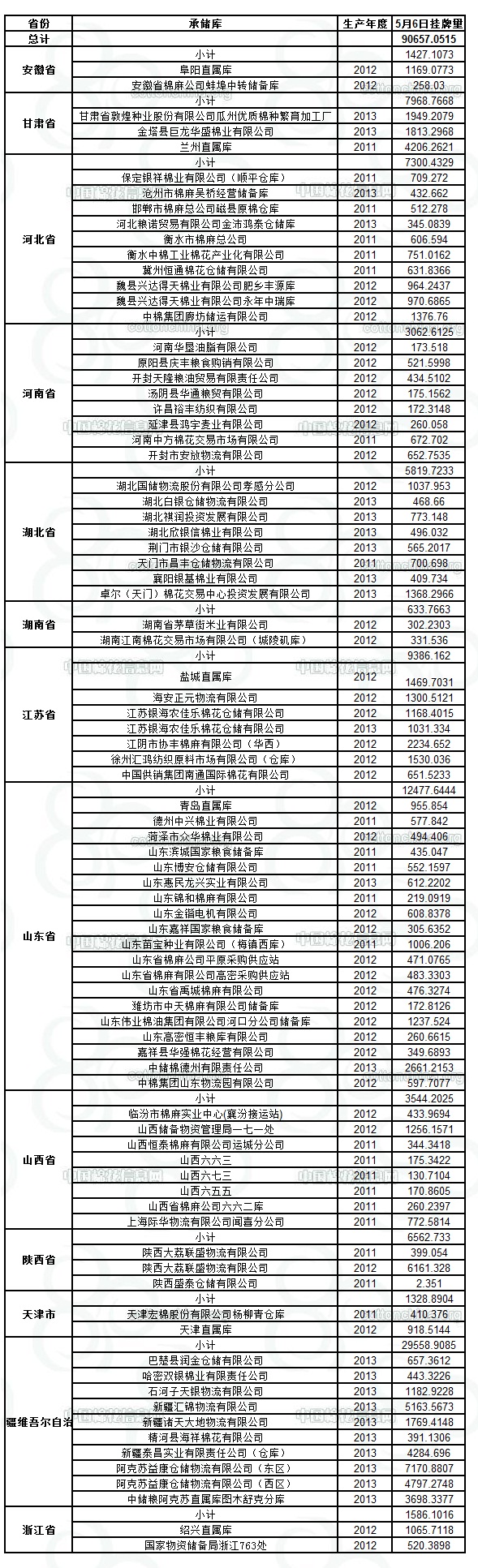 定于5月6日出庫銷售儲備棉90657.0515噸。其中2011年度國產(chǎn)棉14246.8625噸,2012年度國產(chǎn)棉33925.1881噸,2013年度國產(chǎn)棉42485.0009噸。今日無進口棉。相關批次公檢數(shù)據(jù)見附件。具體庫點如下: