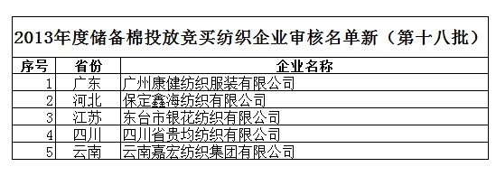 2013年度儲(chǔ)備棉投放競(jìng)買(mǎi)紡織企業(yè)審核名單新(第十八批)