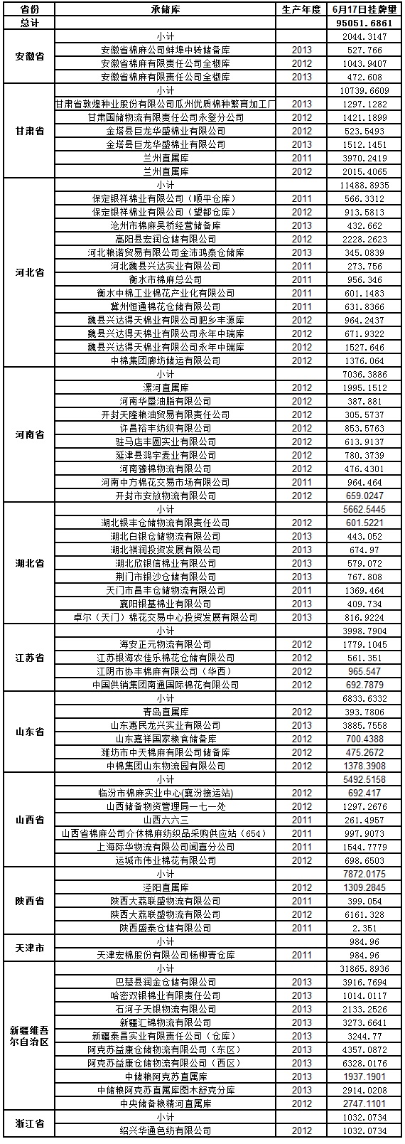 定于6月17日出庫銷售儲備棉95051.6861噸,其中2011年資源13524.1339噸,2012年資源40244.0613噸,2013年資源41283.4909噸。相關(guān)批次公檢數(shù)據(jù)見附件,具體庫點如下: