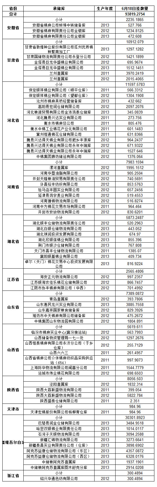 定于6月18日出庫銷售儲(chǔ)備棉93819.2754噸。其中2011年資源13388.8699噸,2012年資源37687.4818噸,2013年資源42742.9237噸。相關(guān)批次公檢數(shù)據(jù)見附件,具體庫點(diǎn)如下: