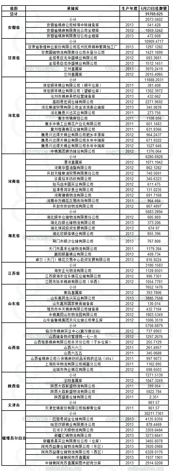 定于6月23日出庫銷售儲備棉91769.025噸。其中2011年度國產(chǎn)棉13140.6366噸,2012年度國產(chǎn)棉36031.8109噸,2013年度國產(chǎn)棉42596.5775噸。今日無進口棉。相關批次公檢數(shù)據(jù)見附件。具體庫點如下: