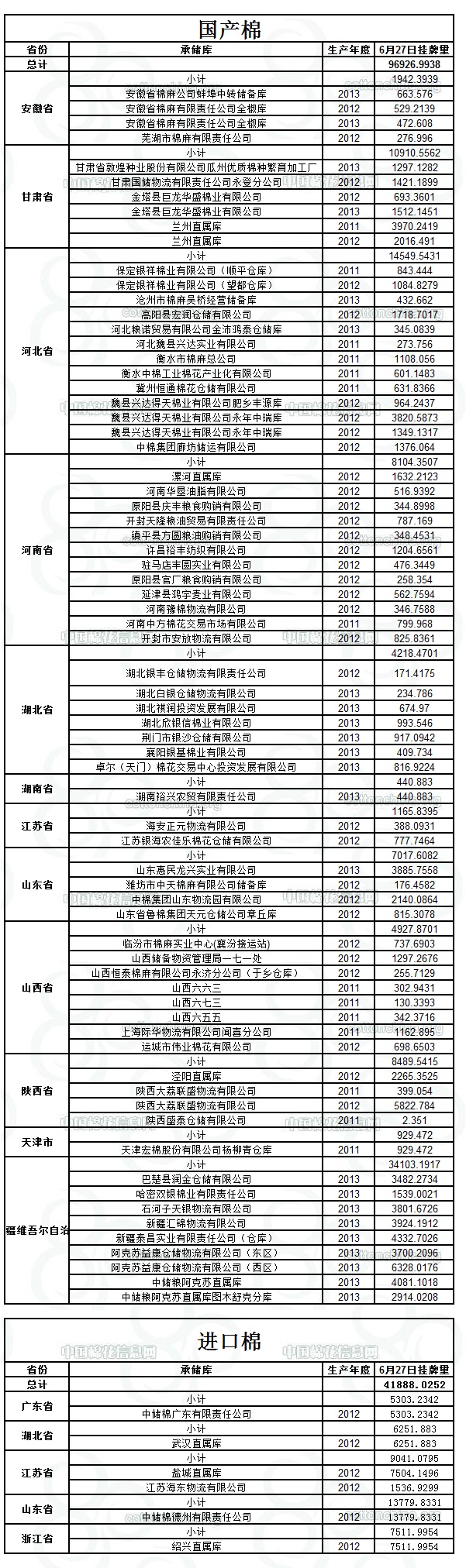 定于6月27日出庫銷售儲(chǔ)備棉138687.7452噸。其中,國產(chǎn)棉96799.72噸,進(jìn)口棉41888.0252噸。相關(guān)批次公檢數(shù)據(jù)見附件。具體庫點(diǎn)如下:
