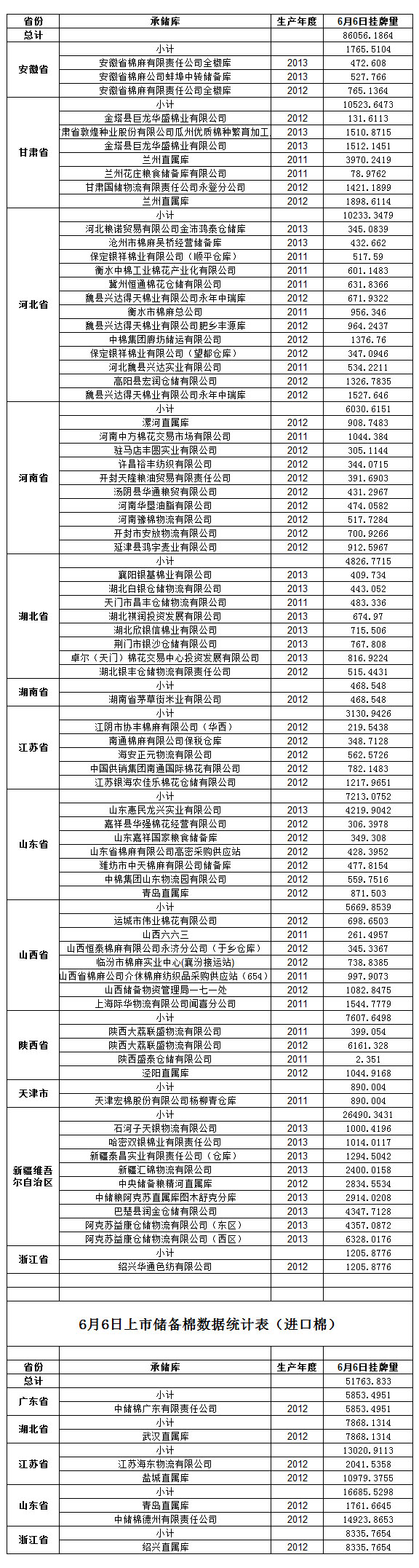 定于6月6日出庫銷售儲備棉137820.0194噸,其中國產(chǎn)棉86056.1864噸(2011年資源12913.67噸,2012年資源36637.6936噸,2013年資源36504.8228噸),進口棉51763.833噸,相關(guān)批次公檢數(shù)據(jù)見附件,具體庫點如下: