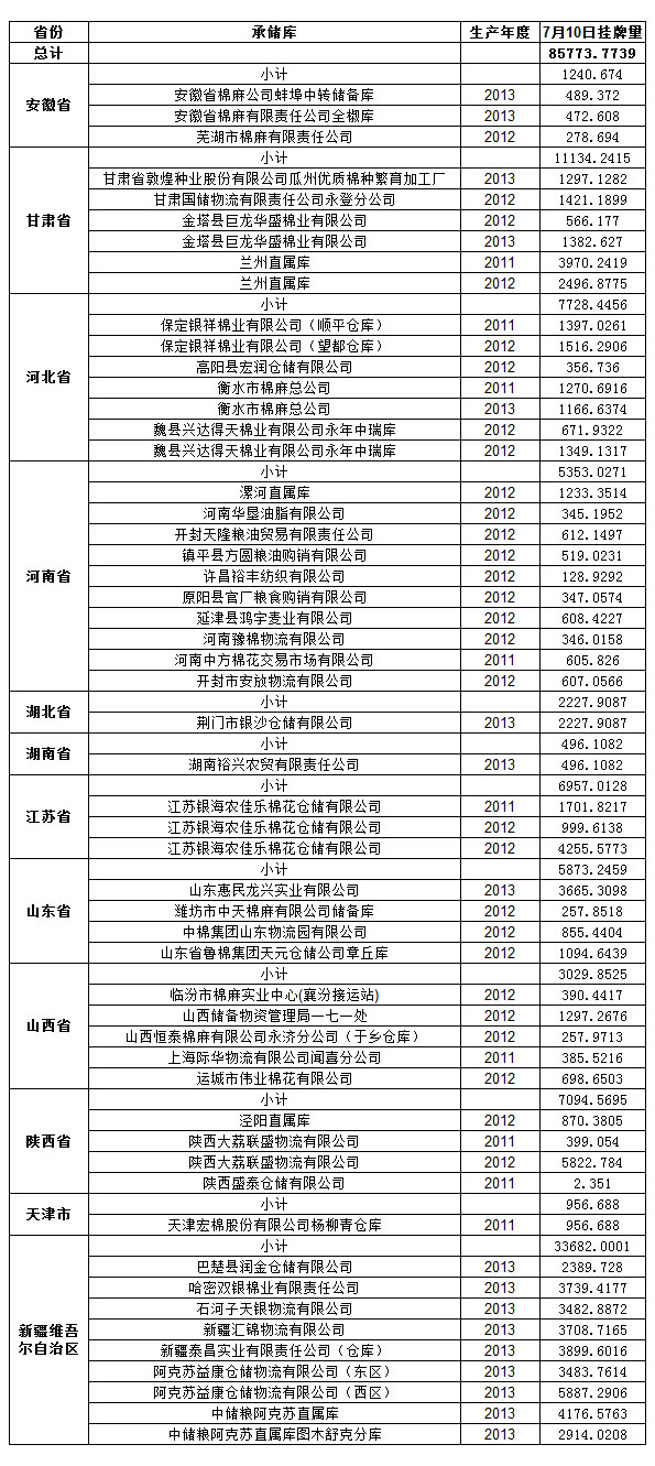 定于7月10日出庫銷售儲備棉85773.7739噸。其中2011年資源10689.2219噸,2012年資源30204.8526噸,2013年資源44879.6994噸。相關(guān)批次公檢數(shù)據(jù)見附件,具體庫點如下: