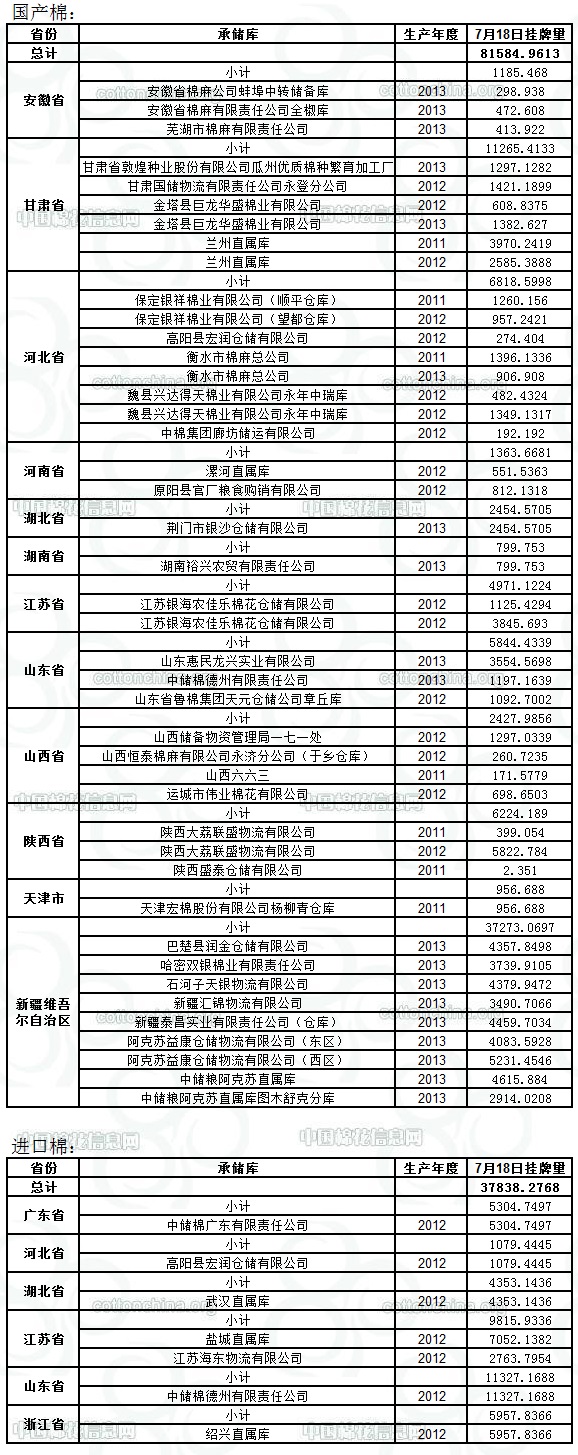 定于7月18日出庫銷售儲備棉119423.2381噸。其中國產棉81584.9613噸,進口棉37838.2768噸。相關批次公檢數(shù)據見附件。具體庫點如下: