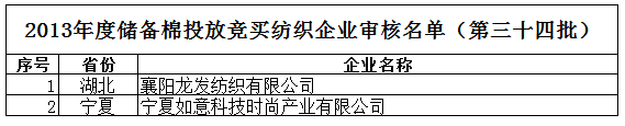2013年度儲(chǔ)備棉投放競(jìng)買紡織企業(yè)審核名單新(第三十四批)
