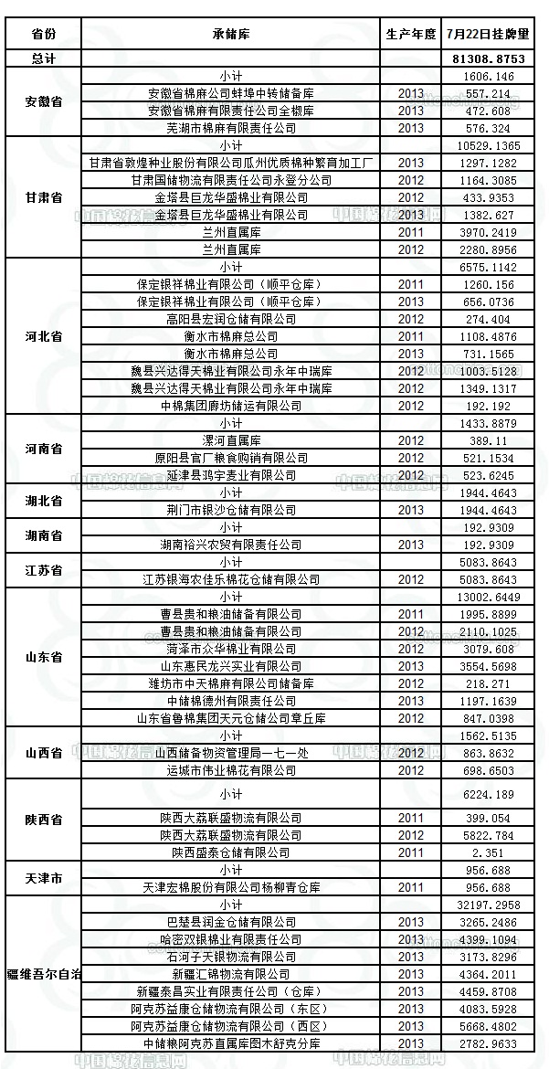 定于7月22日出庫(kù)銷售儲(chǔ)備棉81308.8753噸。其中2011年度國(guó)產(chǎn)棉9692.8684噸,2012年度國(guó)產(chǎn)棉26856.4509噸,2013年度國(guó)產(chǎn)棉44759.556噸。今日無(wú)進(jìn)口棉。相關(guān)批次公檢數(shù)據(jù)見附件。具體庫(kù)點(diǎn)如下: