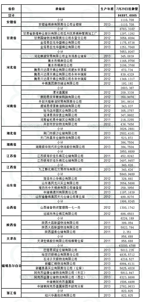各紡織企業(yè): 定于7月29日出庫銷售儲備棉84897.6065噸。其中2011年度國產(chǎn)棉3701.9903噸,2012年度國產(chǎn)棉22081.7847噸,2013年度國產(chǎn)棉59113.8315噸。今日無進口棉。相關(guān)批次公檢數(shù)據(jù)見附件。具體庫點如下: