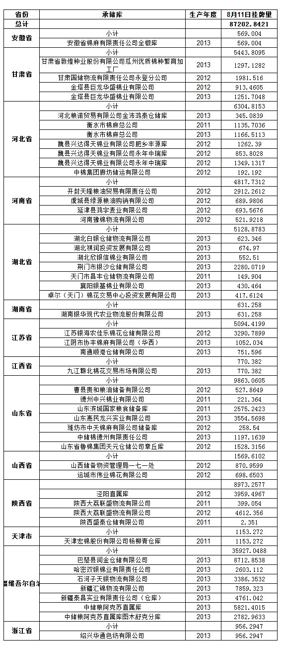 定于8月11日出庫銷售儲備棉87202.8421噸。其中2011年度國產(chǎn)棉5636.8909噸,2012年度國產(chǎn)棉27117.1975噸,2013年度國產(chǎn)棉54448.7537噸。今日無進(jìn)口棉。相關(guān)批次公檢數(shù)據(jù)見附件。具體庫點(diǎn)如下: