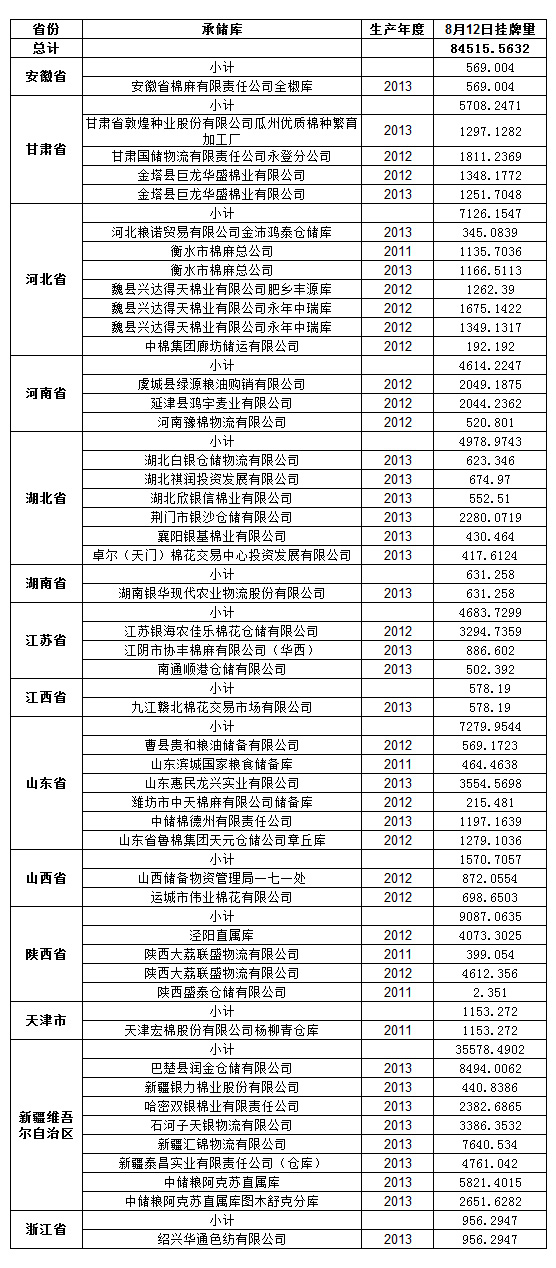 各紡織企業(yè): 定于8月12日出庫銷售儲備棉84515.5632噸。其中2011年度國產棉3154.8444噸,2012年度國產棉27867.3517噸,2013年度國產棉53493.3671噸。今日無進口棉。相關批次公檢數據見附件。具體庫點如下: