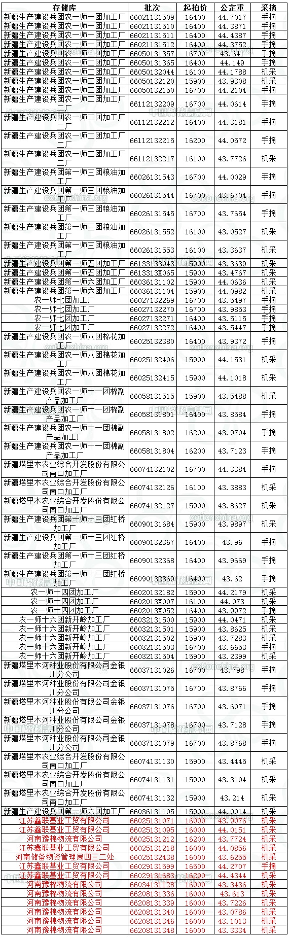 各交易商: 定于8月13日投放新疆兵團(tuán)競(jìng)賣棉花3068.0533噸,其中內(nèi)地庫(kù)占568.3038噸。相關(guān)批次公檢數(shù)據(jù)見附件。具體庫(kù)點(diǎn)如下:
