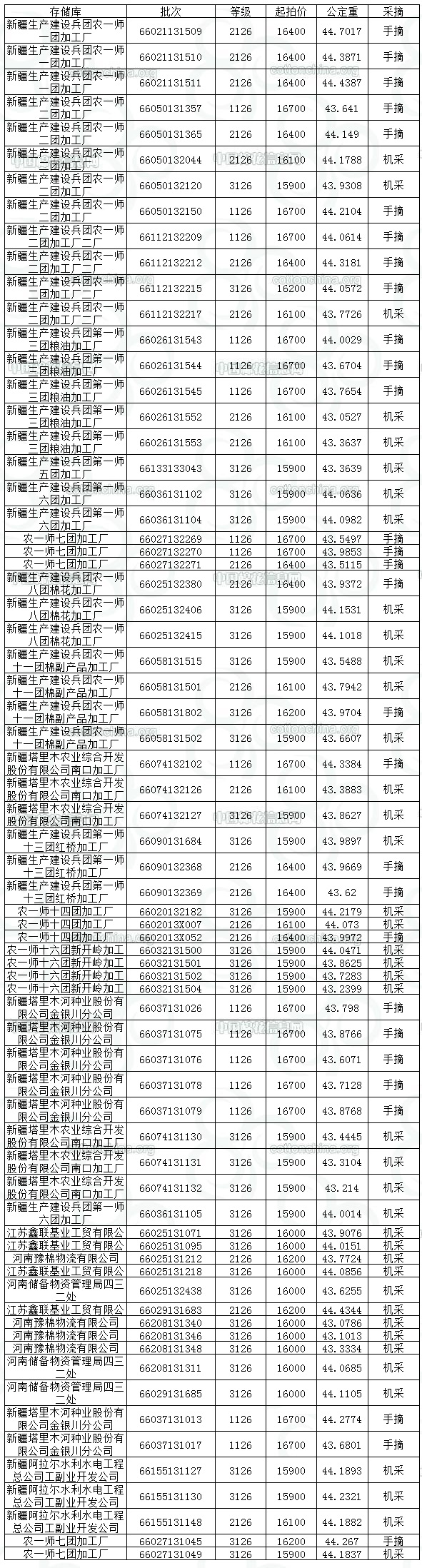 各交易商: 定于8月14日投放新疆兵團(tuán)競(jìng)賣(mài)棉花3071.1645噸,其中內(nèi)地庫(kù)占481.5329噸。相關(guān)批次公檢數(shù)據(jù)見(jiàn)附件。具體庫(kù)點(diǎn)如下: