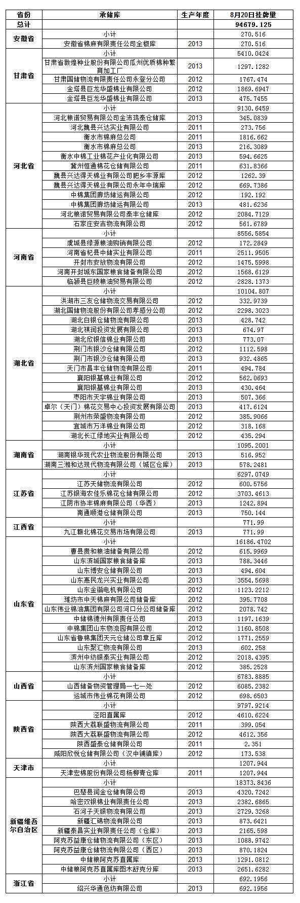 定于8月20日出庫(kù)銷售儲(chǔ)備棉94679.125噸。其中2011年度國(guó)產(chǎn)棉7338.3381噸,2012年度國(guó)產(chǎn)棉49931.7998噸,2013年度國(guó)產(chǎn)棉37408.9871噸。相關(guān)批次公檢數(shù)據(jù)見附件。具體庫(kù)點(diǎn)如下: