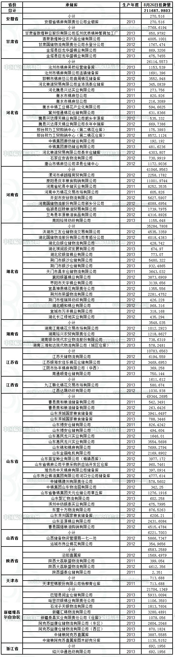 各紡織企業(yè): 定于8月26日出庫銷售儲(chǔ)備棉211687.9803噸。其中2011年度國產(chǎn)棉16886.9957噸,2012年度國產(chǎn)棉146379.8343噸,2013年度國產(chǎn)棉48421.1503噸。相關(guān)批次公檢數(shù)據(jù)見附件,具體庫點(diǎn)如下: