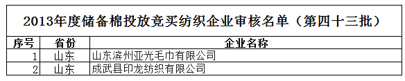 2013年度儲備棉投放競買紡織企業(yè)審核名單新(第四十三批)