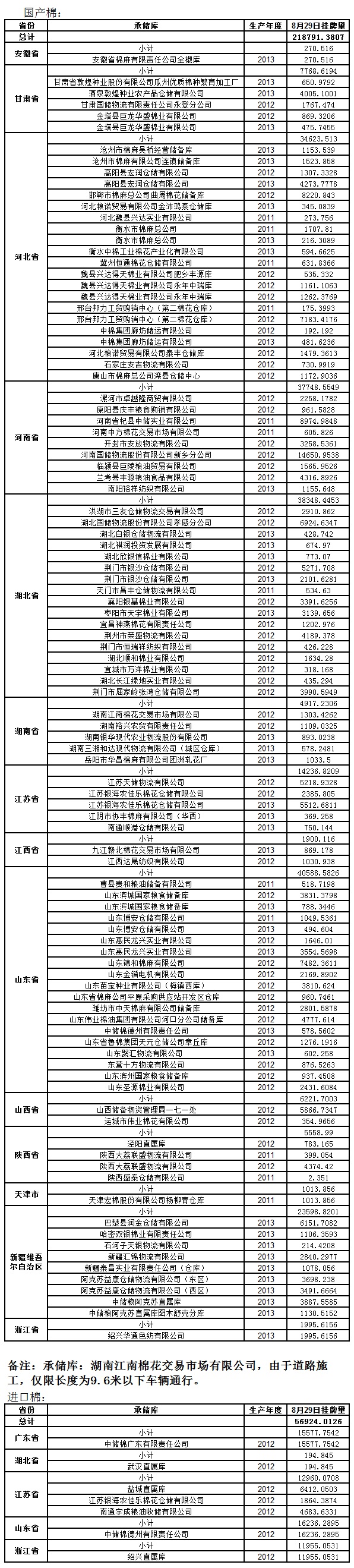 各紡織企業(yè): 定于8月29日出庫銷售儲備棉275715.3933噸。其中國產棉218791.3807噸,進口棉56924.0126噸。相關批次公檢數據見附件。具體庫點如下: