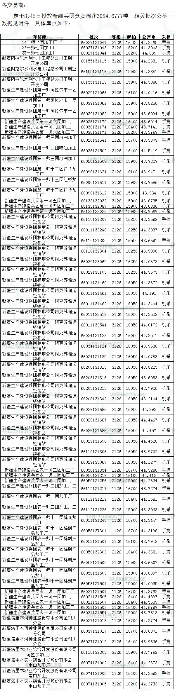 錦橋紡織網(wǎng)—資訊頻道> 棉花信息> 拋儲(chǔ)>正文 8月5日兵團(tuán)棉花計(jì)劃投放3085噸 ——競(jìng)賣預(yù)告