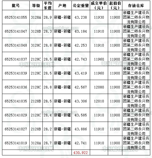 10月12日新疆棉競賣交易推出資源量為5039.822噸,實際成交430.922噸,成交比例8.55%;最高成交價12080元/噸,最低成交價11910元/噸,平均價格11949元/噸,平均長度28.56。