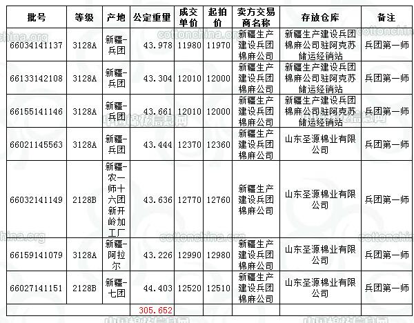 10月13日新疆棉競賣交易兵團專場推出資源量為13992.496噸,(全部為兵團第一師資源),實際成交305.6520噸,成交率2.18%,最高成交價12990元/噸,最低成交價11980元/噸,成交均價12379元/噸,平均長度28.34。中國棉花信息網統(tǒng)計,截至10月13日,兵團已累計成交資源41035.101噸。