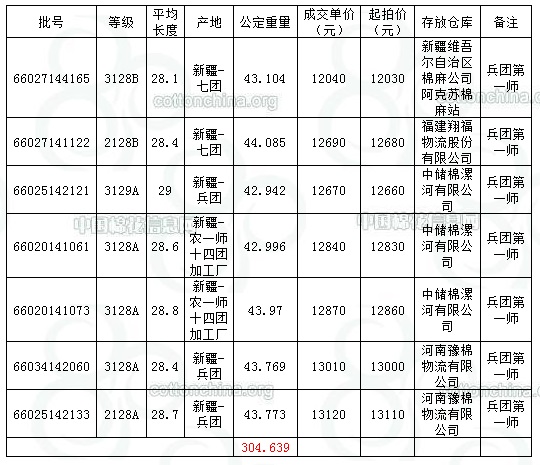 10月14日新疆棉競賣交易兵團專場推出資源量為13686.844噸,(全部為兵團第一師資源),實際成交304.6390噸,成交率2.23%,最高成交價13120元/噸,最低成交價12040元/噸,成交均價12748元/噸,平均長度28.57。中國棉花信息網(wǎng)統(tǒng)計,截至10月14日,兵團已累計成交資源41339.74噸。