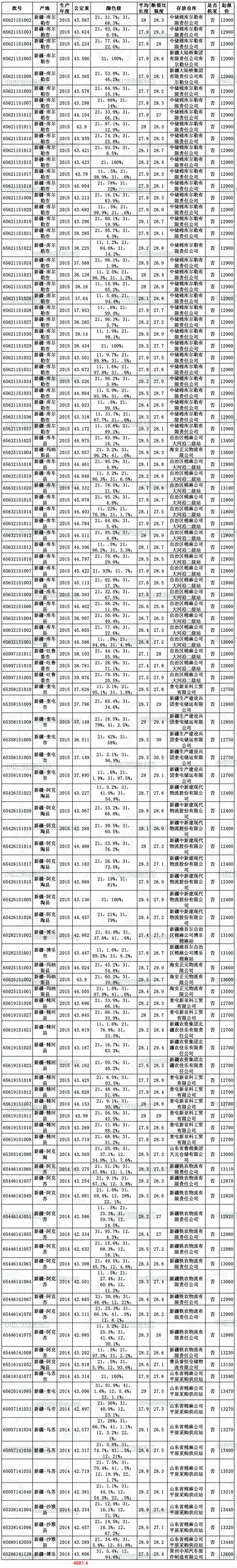 全國棉花交易市場定于10月22日上市新疆棉競賣資源4681.405噸,全部為手摘棉,其中新疆庫區(qū)資源3946.435噸,最低起報價12300元/噸;(2015年新資源占3431.501噸,最低起報價12300元/噸)。內(nèi)地庫區(qū)資源734.97噸,最低起報價12600元/噸;(2015年新資源占176.286噸,最低起報價13500元/噸)。當日雙28以上資源(斷裂比強度28+,平均長度28+)1432.406噸,最低起報價為12400元/噸。