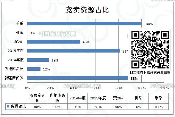 全國棉花交易市場定于10月27日上市新疆棉競賣資源4528.389噸,均為手摘棉資源。其中新疆庫區(qū)資源4004.654噸,(2015年度資源占3402.513噸,最低起報價12300元/噸;2014年度資源占602.141噸,最低起報價12870元/噸)。內(nèi)地庫區(qū)資源523.735噸,(2015年度資源占264.566噸,最低起報價13000元/噸;2014年度資源占259.169元/噸,最低起報價12600元/噸)。當日雙28以上資源(斷裂比強度28+,平均長度28+)2088.926噸,最低起報價12300元/噸。