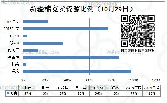 全國(guó)棉花交易市場(chǎng)定于10月29日上市新疆棉競(jìng)賣資源4841.336噸。其中新疆庫(kù)區(qū)資源4192.814噸,內(nèi)地庫(kù)區(qū)資源648.522噸。當(dāng)日雙28以上資源(斷裂比強(qiáng)度28+,平均長(zhǎng)度28+)2088.926噸。當(dāng)日新增6批2015年度資源,存放在新疆庫(kù),其中手采和機(jī)采各占3批。