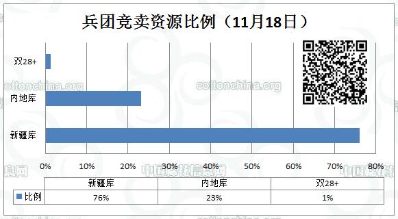11月18日新疆生產(chǎn)建設兵團競賣專場推出棉花9723.162噸,全部第一師資源,最低起報價12060元/噸。新疆庫占7461.411噸,內(nèi)地庫占2261.751噸。當日雙28以上資源(斷裂比強度28+,平均長度28+)132.165噸。