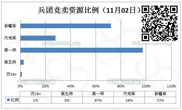 11月2日新疆生產(chǎn)建設兵團競賣專場推出棉花11515.14噸,其中第一師資源占11208.284噸,最低起報價12060元/噸;第五師資源占306.859噸,最低起報價11840元/噸。當日雙28以上資源(斷裂比強度28+,平均長度28+)132.165噸,最低起報價12400元/噸。