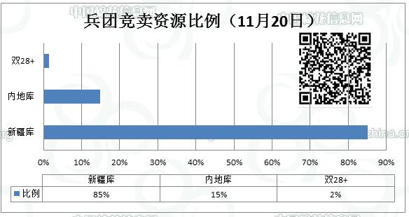 11月20日新疆生產(chǎn)建設(shè)兵團(tuán)競(jìng)賣(mài)專(zhuān)場(chǎng)推出棉花8764.204噸,全部第一師資源,最低起報(bào)價(jià)12060元/噸。新疆庫(kù)占7461.411噸,內(nèi)地庫(kù)占1302.793噸。當(dāng)日雙28以上資源(斷裂比強(qiáng)度28+,平均長(zhǎng)度28+)132.165噸。