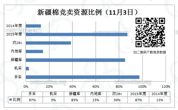 全國棉花交易市場定于11月3日上市新疆棉競賣資源4920.373噸。其中新疆庫區(qū)資源4191.401噸,內(nèi)地庫區(qū)資源728.972噸。當日雙28以上資源(斷裂比強度28+,平均長度28+)1903.945噸。當日新疆庫新增18批2015年度資源779.26噸,均為手摘棉,最低起報價12250元/噸。