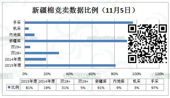 全國(guó)棉花交易市場(chǎng)定于11月5日上市新疆棉競(jìng)賣資源4976.609噸。其中新疆庫(kù)區(qū)資源4545.948噸,內(nèi)地庫(kù)區(qū)資源430.661噸。當(dāng)日雙28以上資源(斷裂比強(qiáng)度28+,平均長(zhǎng)度28+)1519.316噸,雙29以上資源占247.878噸。當(dāng)日新疆庫(kù)新增18批2015年度資源702.887噸,其中最低起報(bào)價(jià)12300元/噸。