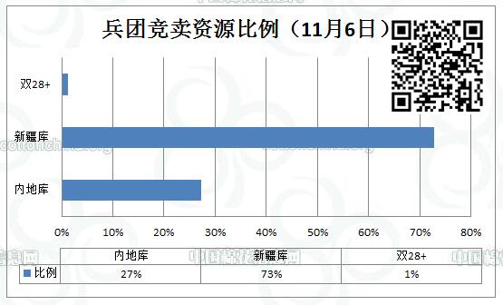 11月6日新疆生產(chǎn)建設(shè)兵團(tuán)競賣專場推出棉花10247.904噸,全部第一師資源,最低起報(bào)價(jià)12060元/噸。新疆庫占7461.411噸,內(nèi)地庫占2786.493噸。當(dāng)日雙28以上資源(斷裂比強(qiáng)度28+,平均長度28+)132.165噸,最低起報(bào)價(jià)12400元/噸。