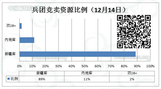 12月14日新疆生產(chǎn)建設兵團競賣專場推出棉花7331.046噸,全部第一師資源,最低起報價12130元/噸。新疆庫占6506.015噸,內地庫占825.031噸。當日雙28以上資源(斷裂比強度28+,平均長度28+)132.165噸。