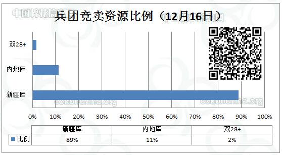 12月16日新疆生產(chǎn)建設(shè)兵團(tuán)競賣專場推出棉花7287.554噸,全部第一師資源,最低起報價12130元/噸。新疆庫占6506.015噸,內(nèi)地庫占781.539噸。當(dāng)日雙28以上資源(斷裂比強(qiáng)度28+,平均長度28+)132.165噸。