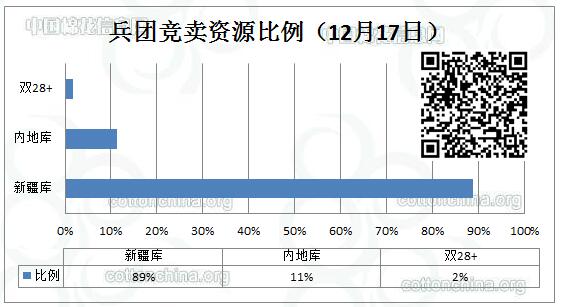 12月17日新疆生產(chǎn)建設兵團競賣專場推出棉花7287.554噸,全部第一師資源,最低起報價12130元/噸。新疆庫占6506.015噸,內地庫占781.539噸。當日雙28以上資源(斷裂比強度28+,平均長度28+)132.165噸。