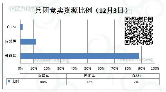 12月3日新疆生產(chǎn)建設兵團競賣專場推出棉花7462.633噸,全部第一師資源,最低起報價12130元/噸。新疆庫占6593.627噸,內(nèi)地庫占869.006噸。當日雙28以上資源(斷裂比強度28+,平均長度28+)132.165噸。