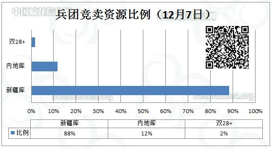12月7日新疆生產(chǎn)建設(shè)兵團(tuán)競(jìng)賣專場(chǎng)推出棉花7462.633噸,全部第一師資源,最低起報(bào)價(jià)12130元/噸。新疆庫(kù)占6593.627噸,內(nèi)地庫(kù)占869.006噸。當(dāng)日雙28以上資源(斷裂比強(qiáng)度28+,平均長(zhǎng)度28+)132.165噸。