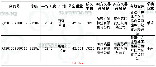 7月10日新疆棉競賣交易推出資源量為5788.622噸,實際成交84.8290噸,成交比例1.47%;成交均價13210元/噸,長度28.45。
