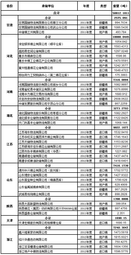 定于7月14日出庫(kù)銷售儲(chǔ)備棉50812.1811噸。其中2012年度國(guó)產(chǎn)棉12850.4792噸,2012年度進(jìn)口棉20803.8183噸;2011年度國(guó)產(chǎn)棉17157.8836噸。相關(guān)批次公檢數(shù)據(jù)見附件。具體庫(kù)點(diǎn)如下: