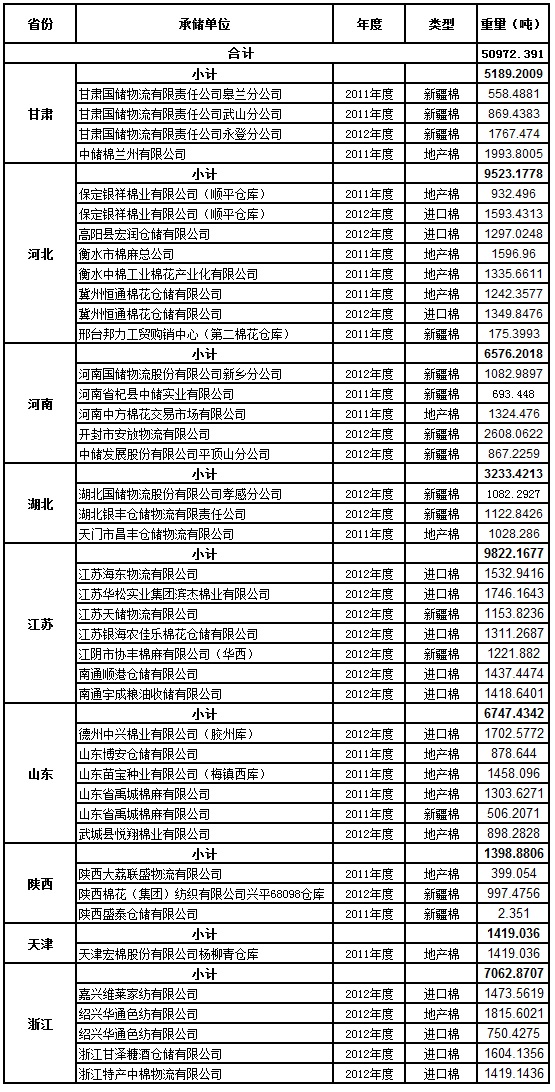 定于7月16日出庫銷售儲備棉50972.391噸。其中2012年度國產(chǎn)棉14617.9532噸(最低起拍價(jià)12790元/噸,捆號47500112513),2012年度進(jìn)口棉18636.6116噸(最低起拍價(jià)13980元/噸,捆號分別為31450112021和31420012037);2011年度國產(chǎn)棉17717.8262噸(最低起拍價(jià)10760元/噸,捆號71510111286)。相關(guān)批次公檢數(shù)據(jù)見附件。具體庫點(diǎn)如下: